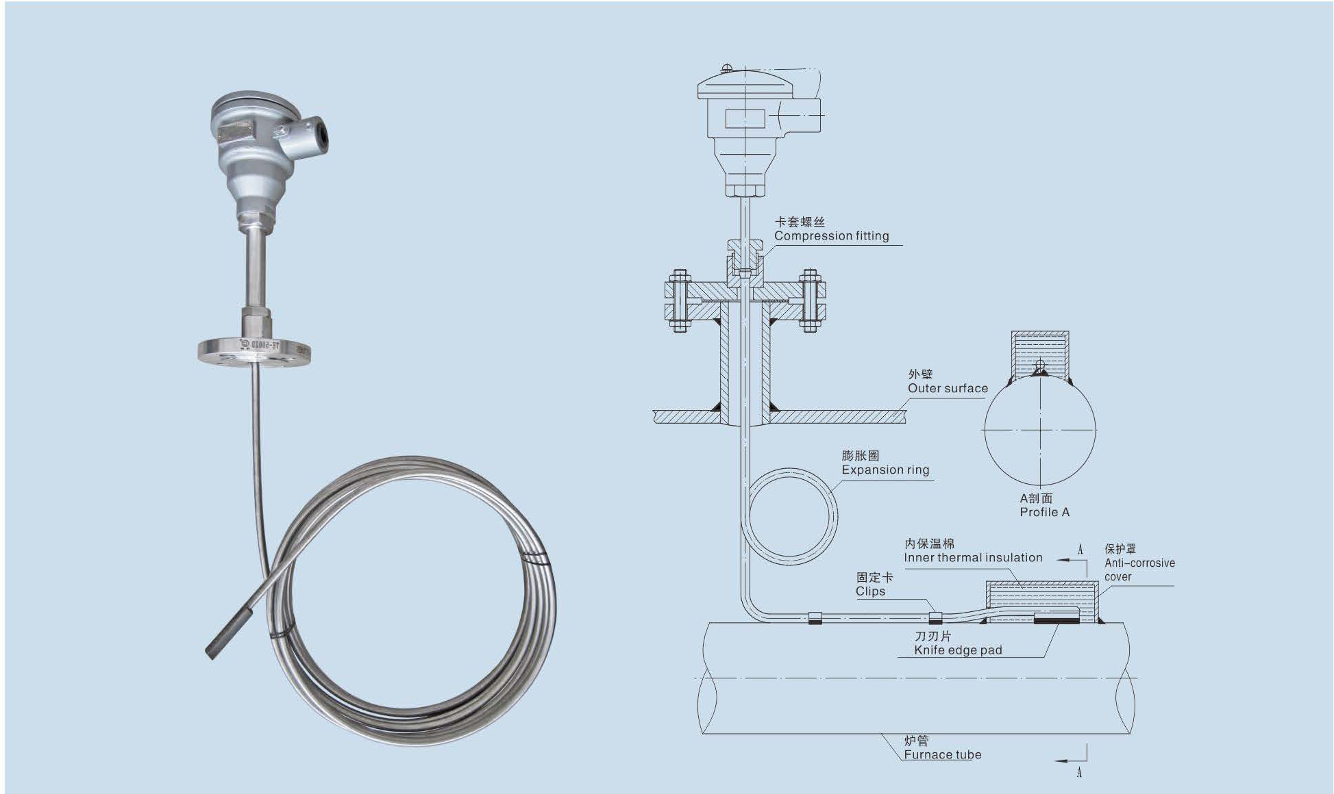 ? 熱電偶為柔性結(jié)構(gòu),鎧裝材質(zhì)耐高溫耐腐蝕。